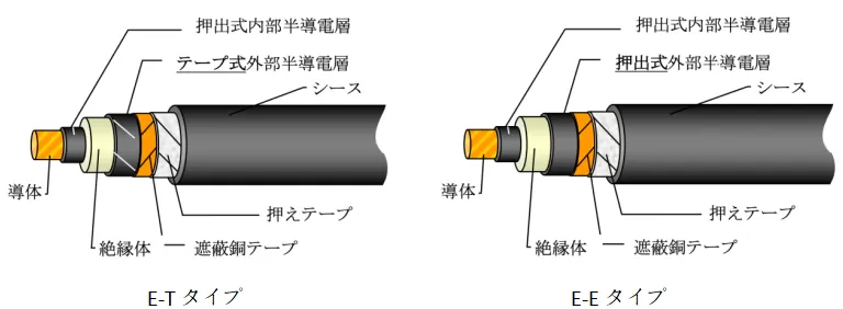 E-T型是将内部半导电层和绝缘体挤出成型后,作为外部半导电层缠绕半导电性胶带的方式。由于胶带界面容易产生细微的台阶和空隙,存在水分侵入和部分放电的风险,因此与E-E型相比耐水密特性较差。另一方面,具有施工时终端处理相对容易的优点,广泛用于面向一般用户等。