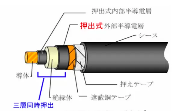 E-E型采用内部半导电层、绝缘体、外部半导电层3层同时挤出成型的方式。这种“三层同时挤出”工艺使各层界面在分子水平上连续平滑地形成,防止异物混入和空隙产生。其特点是耐水特性极其出色,长期可靠性高。JEAC 8011(高压受电设备规程)也从耐水性和安全性的观点推荐了E-E型。
