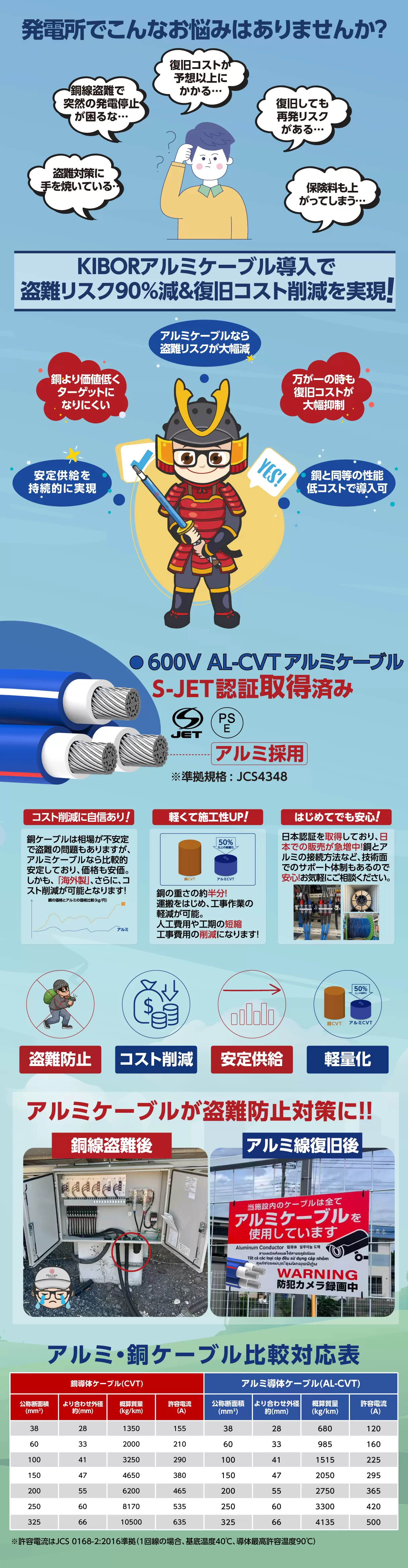 従来の銅導体CVケーブルと同等の耐用年数を持ちます。