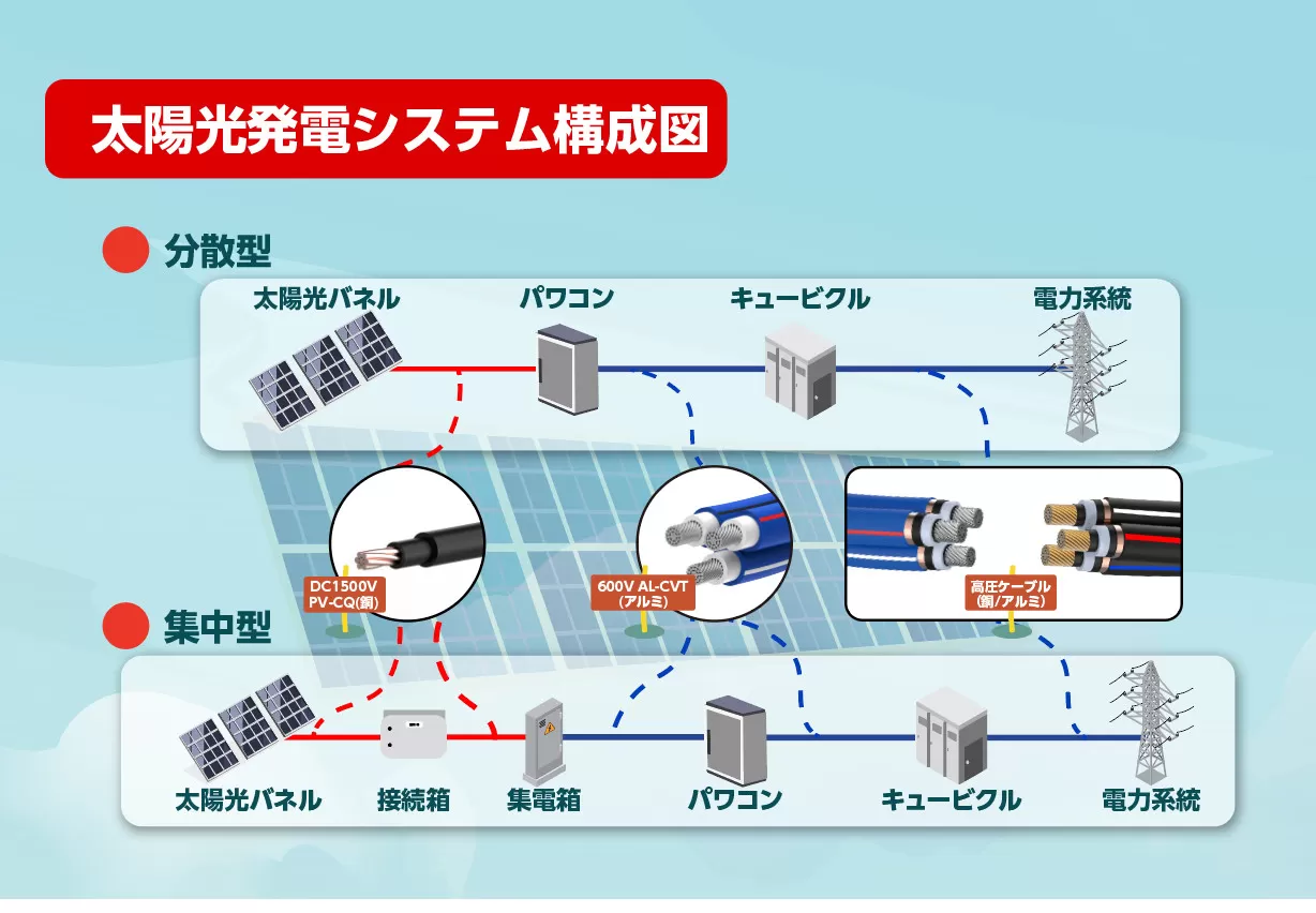 高圧アルミ・銅ケーブル(3300V/6600V/11kV/22kV/33kV)は、大規模太陽光発電システムや産業用電力設備向けに設計された電力伝送用ケーブルです。アルミ導体は軽量でコスト効率に優れ、盗難防止にも効果的。銅導体は高い導電性と信頼性を実現し、特に高効率が求められる場面に適しています。高電圧環境下でも安定した送電を可能にし、システム全体の効率向上と長期的な信頼性に貢献します。